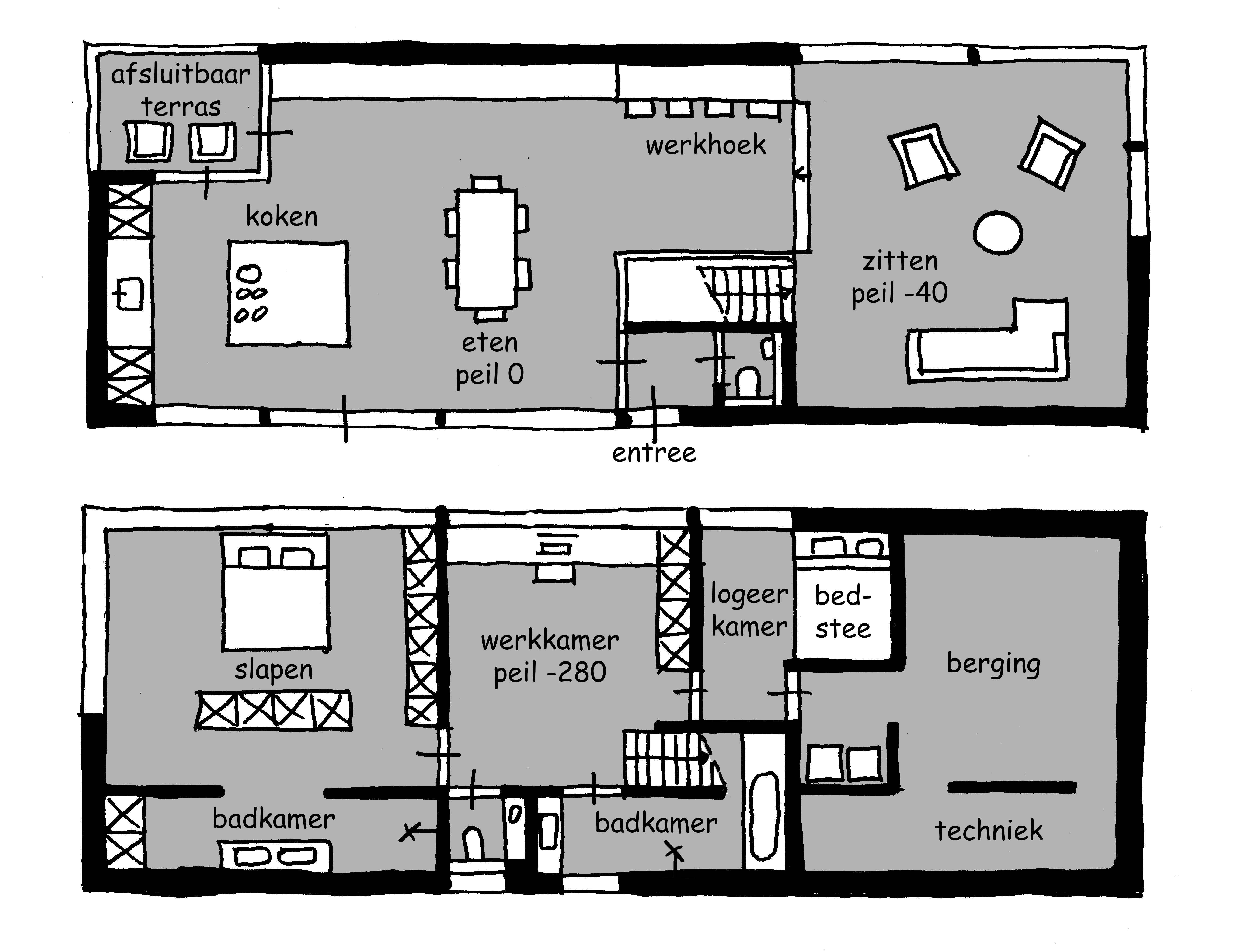 Binnen maakt het daglicht – niet alleen vanuit de pui, maar ook vanuit het dak – de balans tussen openheid en volledige privacy spannend: zicht op het water tegenover de intimiteit van de gesloten achterkant. De kozijnen van de raampartijen in de overwegend zwarte woonkamer zijn aan de onderkant verzonken achter de vloer en aan de bovenkant verborgen achter de stalen liggers. Daardoor zijn de kozijnen nauwelijks zichtbaar en lijkt het alsof de gepolijste kiezelbetonvloer doorloopt in het water. En omdat de stalen kolommen van de hoofdconstructie bewust zijn weggelaten in de glazen hoeken van de ark, kijk je zonder belemmering uit naar buiten. Dat maakt het uitzicht op het spiegelende water een belevenis, zowel overdag als ’s nachts.