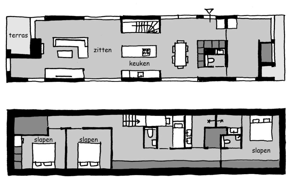 Boven is er veel leefruimte, met een aparte, af te scheiden kinderhoek. Beneden bevinden zich de slaapkamers, de doucheruimtes, een ruimte voor de wasmachine en de droger, en de technische ruimte. We dachten dat onder water slapen vreemd zou zijn, maar door de koekoeken hebben we ook op deze verdieping voldoende lichtinval.