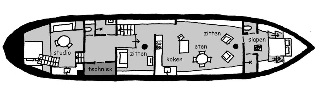 De binnenzijde van het schip is grofweg in drie ‘compartimenten’ verdeeld, met elk een uitgang naar buiten. De ruimten in het schip zijn zo met elkaar verbonden dat ze nog steeds een eenheid vormen. Naast de woonkeuken in het stuurhuis en het gastenverblijf achterin, is er voorin een multifunctionele ruimte die kan worden gebruikt als woonkamer, vergaderruimte of kookatelier voor ons cateringbedrijf. Een huiskamerconcert of ander kleinschalig initiatief: het kan allemaal bij ons aan boord.