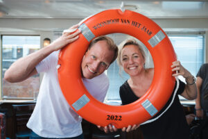 De prijsuitreiking vond plaats aan boord van Het wapen van Amsterdam. Aarnoud en Nienke ontvingen de felbegeerde oranje reddingsboei als prijs. En eeuwige roem natuurlijk, want het is verplicht de boei aan je woonboot te laten hangen…;)